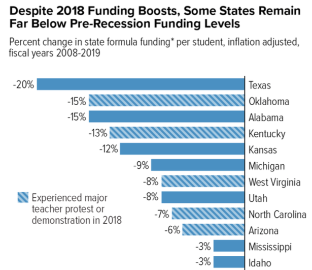 Last year’s teacher strikes, protests and walkouts have resulted in some increases in state education funding, but finance levels have not returned to pre-recession levels, according to a Center on Budget and Policy Priorities (CBPP) analysis released Wednesday.